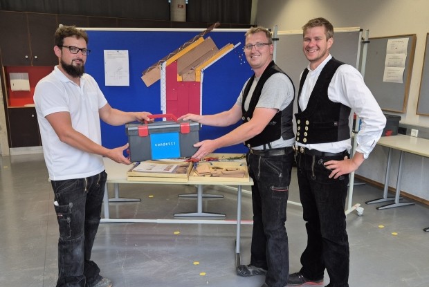 Für noch mehr Praxisnähe im Unterricht der Zimmerer-Azubis: Die Staatliche Berufsschule Neustadt/Aisch hat jetzt vier Condetti-Koffer erhalten. Übergeben wurden sie von Obermeister der Zimmerer-Innung Neustadt an der Aisch–Bad Windsheim gemeinsam mit Lehrlingswart und Prüfungsvorsitzendem Sven Unger an Berufsschullehrer Thomas Flory.