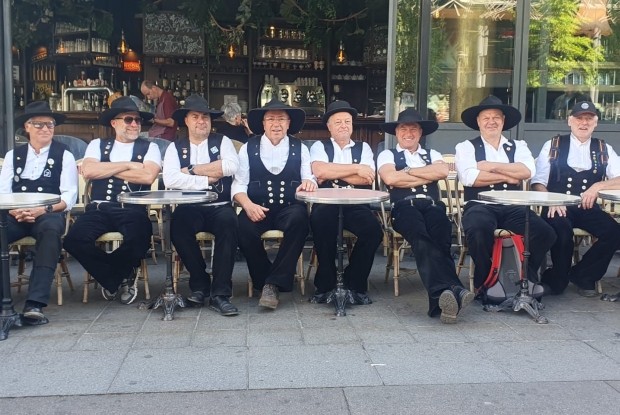 Auch in Paris zeigten die bayerischen Zimmerer, hier bei einer Kaffeepause, stolz ihre Kluft.