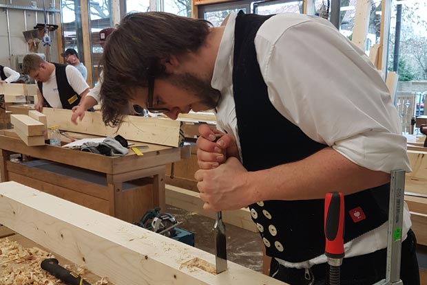 Nach einem Monat im Berufsgrundschuljahr-Zimmerer erzählt Maxi Kirr (16) aus Pittenhart: „Bisher gefällt es mir echt gut“, er macht sein BGJ an der Berufsschule Traunstein: „Der Unterricht ist ganz anders als früher an der Mittelschule. Man hat viel mehr Praxis und alles ist auf den späteren Beruf als Zimmerer ausgerichtet.“