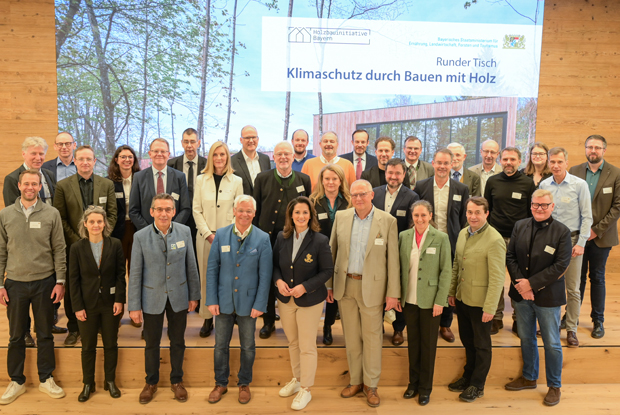 Forstministerin Michaela Kaniber und Experten aus Wirtschaft, Wissenschaft und Verbänden ziehen eine positive Zwischenbilanz der Bayerischen Holzbauinitiative. Vertreten am Runden Tisch „Klimaschutz durch Bauen mit Holz“ war auch der Landesinnungsverband des Bayerischen Zimmererhandwerks (LIV) um Präsident Peter Aicher.